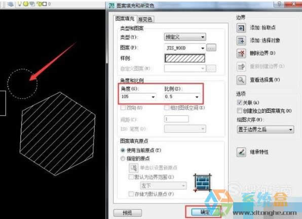 7、回車后剛才的圖案填充窗口和漸變色會(huì)再次彈出來(lái),在角度和比例處不更改設(shè)置,點(diǎn)擊確定,這時(shí)候我們就能將選中的圖案打上剖面線。