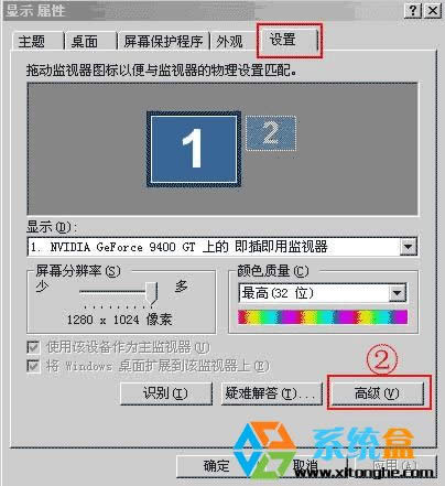 第二步:在彈出的“顯示 屬性”窗口中,點選上方選項卡的“設(shè)置”?“高級”,之后會打開顯示器和顯卡的配置窗口。
