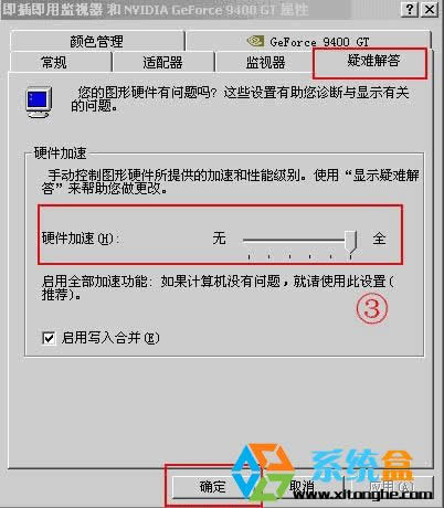 第三步:點擊上方選項卡“疑難解答”,將“硬件加速”全部打開(滑塊拉到最右邊),之后點確定。