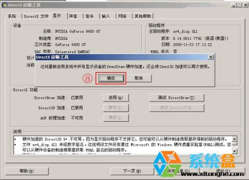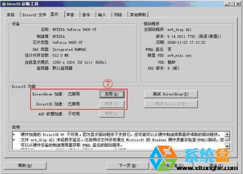 第七步:點擊上方的“顯示”選項卡后,您可看到DirectDraw 和 Direct3D的狀態(tài)。如果為“已禁用”,則點擊旁邊的“啟動”,以開啟顯卡的D3D加速功能(本文由 系統(tǒng)盒 http://www.xitonghe.com 整理)。