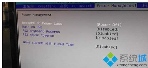4、用鍵盤上的上下左右鍵控制選項(xiàng),選擇POWER MANAGEMENT主選項(xiàng),在主選項(xiàng)中選擇第一項(xiàng),這一項(xiàng)控制是否支持來電啟動,默認(rèn)為關(guān)閉;